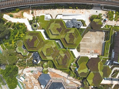 近年来,新加坡注重应对气候变化,不断提高建筑的环境可持续标准,对绿色建筑标志认证设置了最高等级——绿色标志白金奖。三巴旺综合社区中心项目以取得绿色标志白金奖为目标,将绿色环保理念贯穿于项目设计和施工的各个环节。中心的建筑屋顶实现了无土植物全覆盖,在新加坡常年炎热的气候下,这种设计不仅外观上绿意盎然,还可以起到降温、吸音、降噪等作用;园林区域的降雨排水系统运用石块、碎石、植物等天然材料,将雨水汇集起来并层层过滤沉降泥沙,营造出天然河道景象,既美观又能净化水源;项目还采用了大量预制构件,虽然对施工精度提出了很高的要求,但可以最大程度减少施工中产生的建筑垃圾。