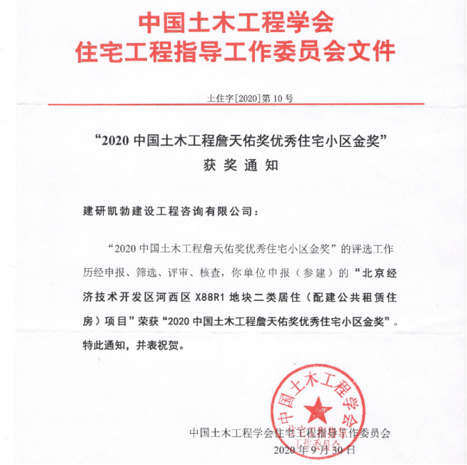 近日 黑白体育平台登录,建研凯勃建设工程咨询有限公司(以下简称“建研凯勃”)监理的北京经济技术开发区河西区X88R1地块二类居住(配建公共租赁住房)项目荣获2020中国土木工程詹天佑奖优秀住宅小区金奖,这是继该项目获得北京市结构长城杯金质奖后的又一重大奖项。