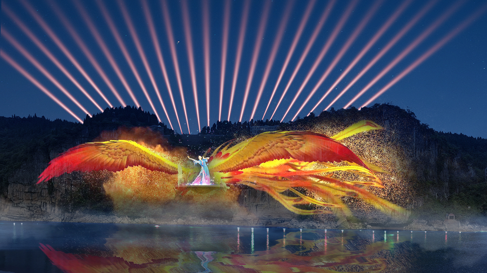 崖壁5D灯光秀尤为新颖,采用“崖壁投影+舞台演绎”的方式,以两侧崖壁为投影载体,中间布置小舞台配合灯光矩阵,将辛女与盘瓠的凄美爱情故事和妖怪来袭国破山河场面 黑白体育在线直播,将军点兵出征的戏剧场面演绎得活灵活现。